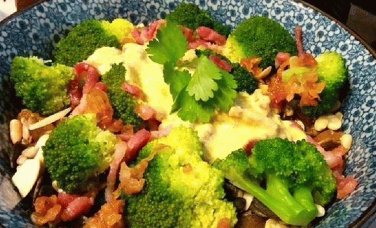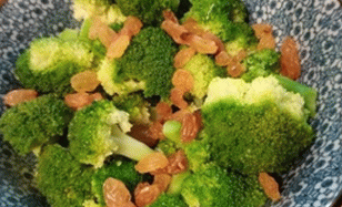 - Rosinen und Brokkoli in eine Salatschüssel geben.