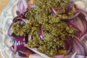 - Mit Pesto-Sauce und Pinienkernen garnieren.