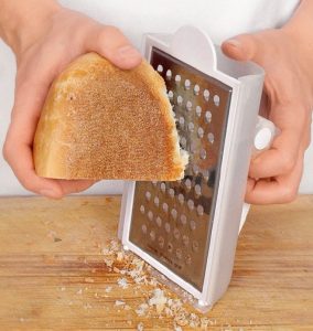 Reiben Sie abgestandenes Brot auf einer groben Reibe.
