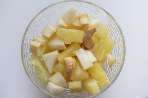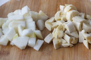 - Birnen-Bananen-Schale und in Würfel schneiden.