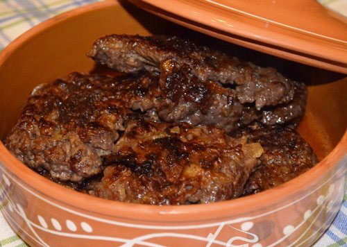 - Das Fleisch in Teller schneiden, leicht schlagen, salzen, pfeffern, kartoffelpüree mit zwiebeln bestreichen, eine stunde beiseite stellen.