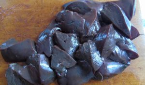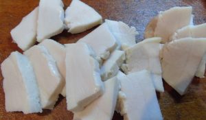 - Schneiden Sie das Fett in Platten in der Größe der Leberstücke.