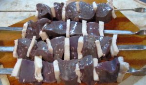 - Spieße abwechselnd mit Speck und Leber bespannen, auch mit fetten Platten zu beenden.