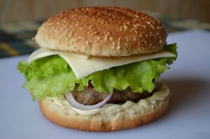 - Putting einen Burger: Mayonnaise auf die untere Hälfte setzen, Wisch, dann – Schnitzel, Mayonnaise, Zwiebelringe, Salat, der Käse.