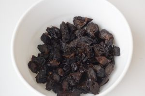 - Die Pflaumen gut ausspülen und in Würfel schneiden. Verbreiten die erste Schicht.