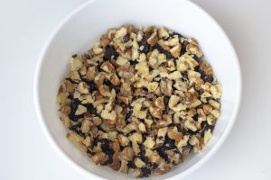 - Die Nüsse fein hacken und in der nächsten Schicht verteilen.