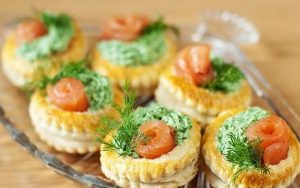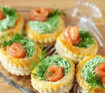- Wir füllen die Körbe mit einer cremigen Spinatmischung und einer Scheibe Filet Lachs.