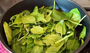 - Zwiebel und Knoblauch fein hacken und goldbraun braten, dann gießen Sie den Spinat. Reduzieren Sie die Hitze und braten Sie zu Spinat aufgeweicht, ca. 3 Minuten. Wir entfernen aus dem Feuer, Salz und Pfeffer