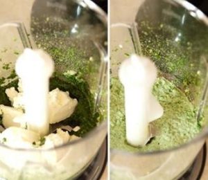- Alles aus der Pfanne in die Mixschüssel geben und cremig dazugeben Käse und hacken.