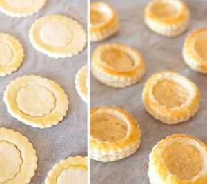 - Blätterteig 2 mm dick ausrollen und Kreise schneiden 6 cm groß An den Rändern und Schnitten entlang schneiden.