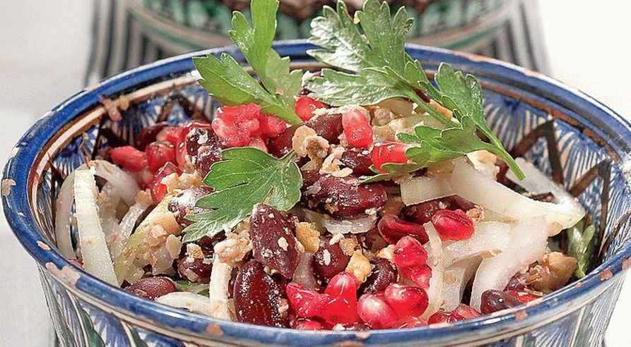 Köstlicher Salat – Bohnen mit Nüssen und Granatapfel – sehr einfach zu Hause kochen. Dieser herzhafte Salat mit einer wunderbaren Kombination Bohnen, saure Granatapfelkerne und Nüsse, ich rate Ihnen dafür zu sorgen schnelles und einfaches Abendessen.