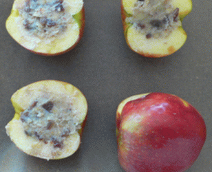 - Füllen Sie mit der Füllung die Äpfel, kombinieren Sie die Hälften und auf ein Backblech legen.