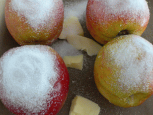 - Die Äpfel mit Zucker bestreuen und die Rahmstücke daneben legen. Öl, den Ofen auf 180 Grad vorheizen und die Äpfel 15-20 backen Minuten.