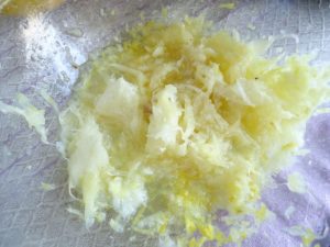 - Geschälte Zitrone reiben und das Fruchtfleisch darüber geben Ein bisschen in jedem Apfel.