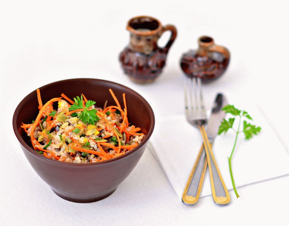 Ich rate Ihnen, zu Hause einen köstlichen Salat mit braunem Reis und Karotten zu kochen. Dies ist nicht nur ein köstlicher, sondern auch ein sehr gesunder Salat! Ich empfehle Den Kürbis in einer trockenen Pfanne trocknen lassen Sonnenblumenkerne.