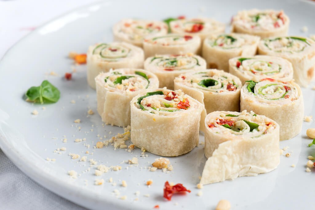 - Bohnenpaste mit gehackten Tomaten und Basilikum bestreuen und Spinat, die sich jeweils ca. 4 cm von den Rändern der Tortilla zurückziehen jede Tortilla in einer Rolle.