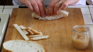 - Mit einem Stück Weißbrot schneiden wir die Ränder ab.