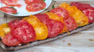 - Tomaten in dünne Ringe schneiden. Brot aufstreichen.