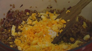 - In Buchweizen fügen Sie Eier und ganze Zwiebeln hinzu, mischen Sie.
