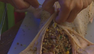 - Füllen Sie den Schweinebauch mit Buchweizen und vernähen Sie ihn mit kulinarischen Fäden.
