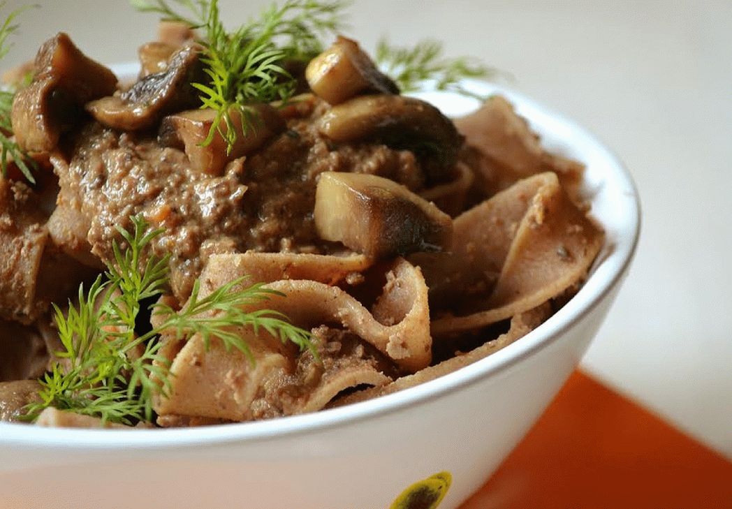 Dies ist ein sehr hausgemachtes Gericht. Seidige Buchweizennudeln lecker Es wird mit einer Paste aus Hühnerleber und Pilzen kombiniert. Zu diesem Gericht gehackte frische Kräuter sind ideal. Zu Hause kochen Buchweizennudeln mit Hühnerleber sind überhaupt nicht schwierig.