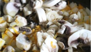 - Gehackte Zwiebel mit geriebenen Möhren in Öl anbraten. Teilen auf er schnitt Champignons. Braten, bis die Pilzflüssigkeit verdunstet ist.