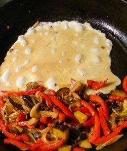 - Bewegen Sie das Gemüse an den Rand der Pfanne, gießen Sie das Ei. Sobald es soweit ist nimm ein wenig, dann lege Reis drauf. Alles mischen.