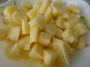 - Kartoffeln in einen Topf mit Gemüse geben. Die Größe der Stücke hängt von Ihrer Präferenz ab. Gießen Sie Fisch Brühe. Salz nach Geschmack. Kochen, bis die Kartoffeln gekocht sind.