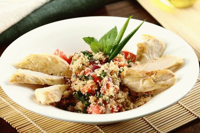 - Couscous mit Gemüse in die Mitte des Tellers legen, die Ränder aufsetzen geschnittenes Huhn in dünne Scheiben geschnitten. Alles bestreuen etwas Zitronensaft. Wenn gewünscht, kann das Gericht sein mit den restlichen Zweigen Petersilie oder Minze garnieren.