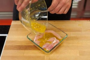 - Das Hähnchengewürz mit Olivenöl verrühren. Damit Hähnchen mit Marinade reiben, dann das Filet heiß anbraten in einer Pfanne, bis das Fleisch fertig ist. Zum leichteren Braten filetieren kann entlang halbiert werden.
