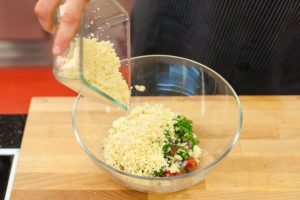 - Während der Brei dampft, müssen die Tomaten in kleine Würfel geschnitten werden, Die Zwiebeln in die gleichen Würfel schneiden. Die Minze kräftig hacken und Petersilie, alle diese Zutaten mit Couscous mischen.