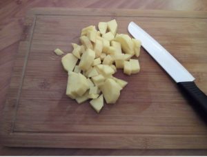 - Wir schneiden die Kartoffeln in Würfel und geben sie auch in die Pfanne. Durch 5 Minuten Suppensalz.