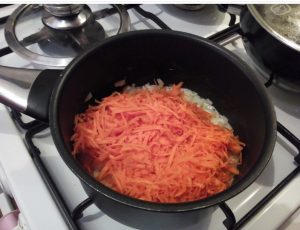 - In einem Topf in Butter gehackte Zwiebeln anbraten bis erröten. Fein geriebene Möhren für Zwiebeln verteilen.