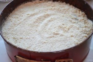 - Die restliche Krume darüber gießen. Wir setzen auf 180 vorgewärmt �1 Stunde im Ofen backen.