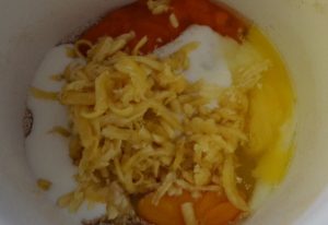 - Fügen Sie die geriebene Banane, Kürbispüree, Eier und Kefir hinzu. Mischen, bis alles glatt ist.