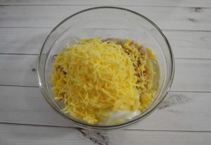 - Fügen Sie das Ei, den Joghurt und den geriebenen Käse hinzu. Mischen.