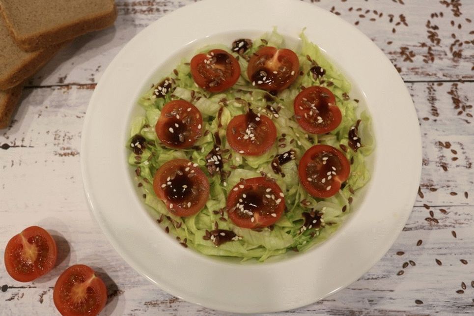 - Auf einem Teller verteilen wir die Blätter auf den Hälften der Tomate.