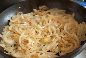 - Zwiebeln, geschält und in halben Ringen zerkleinert, sollten angebraten werden ein Teil Butter bis leichte Karamellfarbe.