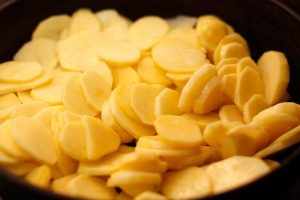 Legen Sie die zweite Schicht Kartoffeln, bestreuen Sie mit Knoblauch, Salz.
