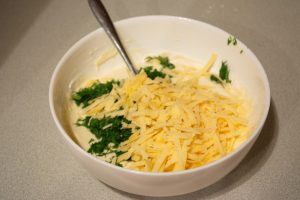 - Reiben Sie den Käse auf einer feinen Reibe und mischen Sie ihn in den Teig. Dann gehacktes grün in den teig einbringen und von uns zubereiten lassen Fischmischung, alles vorsichtig mit einem Spatel mischen