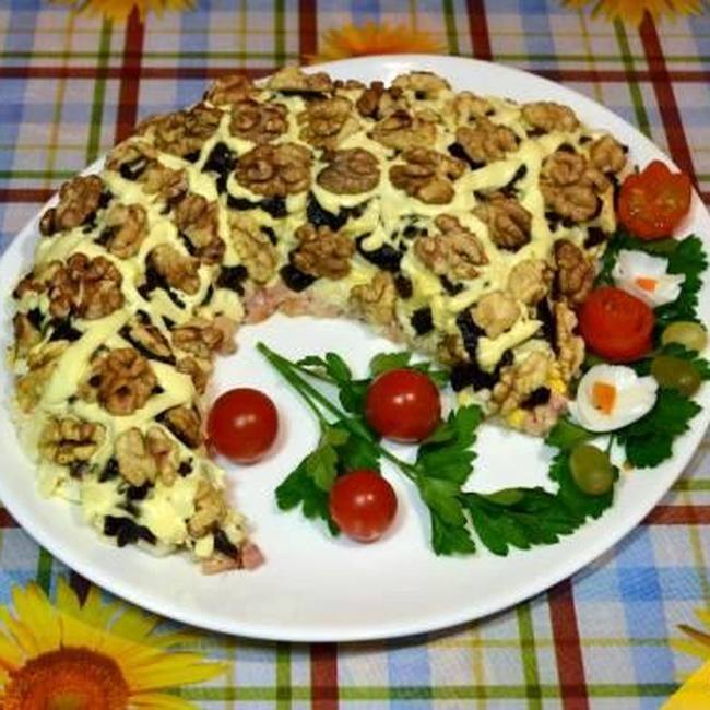 Den Salat mit Pflaumen belegen, mit Mayonnaisennetz und Körnern dekorieren Walnüsse.