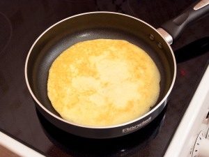 - Schlagen Sie Eier und braten Sie Pfannkuchen von jedem.