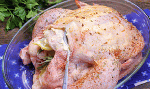 - Reiben Sie das Huhn gründlich und von allen Seiten innen und außen ein Salz, gemahlener Pfeffer und süßer Pfeffer. Das Gewürzset auch Thymian und getrockneter Knoblauch können enthalten sein.