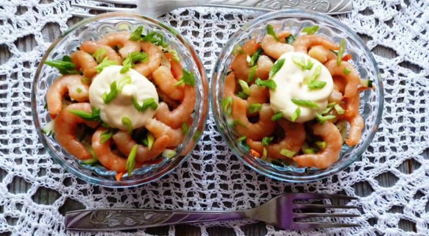 Ein köstlicher Cocktailsalat mit Garnelen, Apfel und Gurke, der kochen Sie einfach zu Hause, ich rate Ihnen, auf dem Feiertagstisch in zu tun portionierte Schalen!