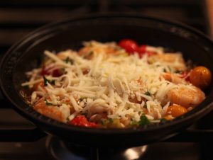 - Die Garnelen zurücklegen, mit gehackter Petersilie bestreuen und geriebener Käse.