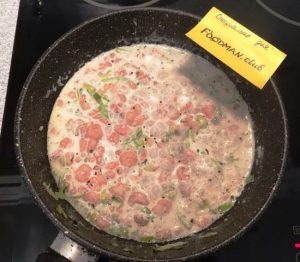 - Nach 5 Minuten Oregano, Basilikum, Pfeffer und Sahne hinzufügen (Milch), Quark. Alles zum Kochen bringen und gehen köcheln lassen, bis es langsam eingedickt ist.