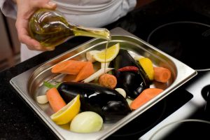 Das gesamte Gemüse gründlich abspülen und schälen. Legen Sie sie auf ein Backblech (ohne Tomaten) Olivenöl einfüllen.