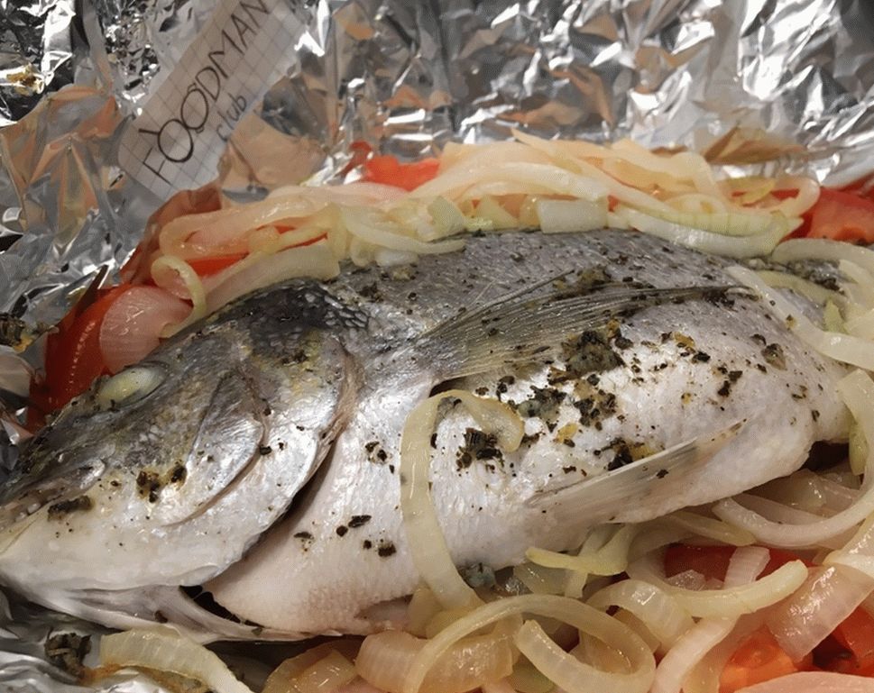 - Decken Sie die Form mit Folie und Fett mit Öl, legen Sie den Fisch, Mit Knoblauchmischung einreiben, mit Zwiebeln und Tomaten füllen. Wrap up Fisch in Folie, aber nicht fest.