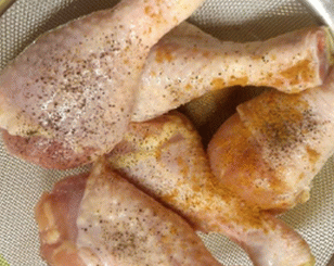 - Meine Hähnchenschenkel. Dies ist bequem in einem Sieb zu tun. Wasser geben abtropfen lassen und überschüssige Feuchtigkeit mit einem Papiertuch entfernen. Mit Salz und Pfeffer bestreuen.