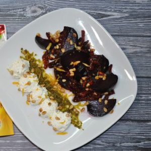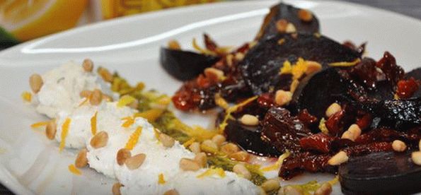 - Das Gericht servieren. Am Rand die Rüben mit Tomate neben die Sauce legen Pesto, mit Tee gebildete Kugeln aus Käsemasse Löffel, alles mit Pinienkernen und geriebener Schale bestreuen eine Orange.